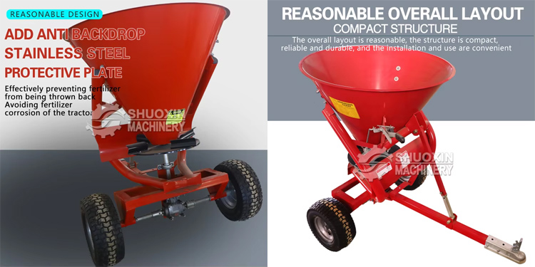 When using it to ensure even distribution of the seeds, adjust the rotational speed to the recommended range, adjust the size of the fertilizer discharge opening according to the type of fertilizer, maintain a constant and straight driving speed (5-8 km/h), before the operation, sieve the dry and unclumped fertilizer and load it evenly, regularly clean the spreading disc and fertilizer discharge opening, and if necessary, calibrate the parameters through trial planting.