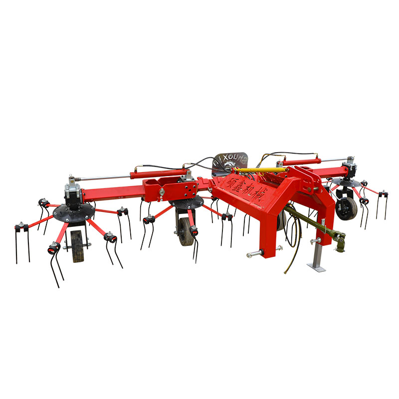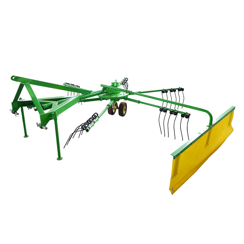 Le râteau est une machine de récolte de fourrage qui intègre les râteaux de pâturage. Une fois le pâturage récolté, afin d'atteindre les conditions de balancement dès que possible, le pâturage doit être éclairé par un écran avec un épandeur. L'épandeur peut répandre uniformément le pâturage sur le terrain, ce qui facilite l'évaporation rapide de l'eau et facilite la coupe du pâturage dans les balles ou sèche avant l'ensilage. Lorsque l'humidité du pâturage peut atteindre un état où elle peut être séchée, les cultures sont rassemblées dans une grange avec un râteau et brisées en bandes en préparation des opérations de liaison. Lorsque le râteau fonctionne, utilisez les dents de printemps pour déplacer la récolte doucement pour rassembler ou étaler le soleil, en évitant les débris mixtes ou les pierres dans la récolte pour améliorer la qualité des pâturages ou des aliments verts.