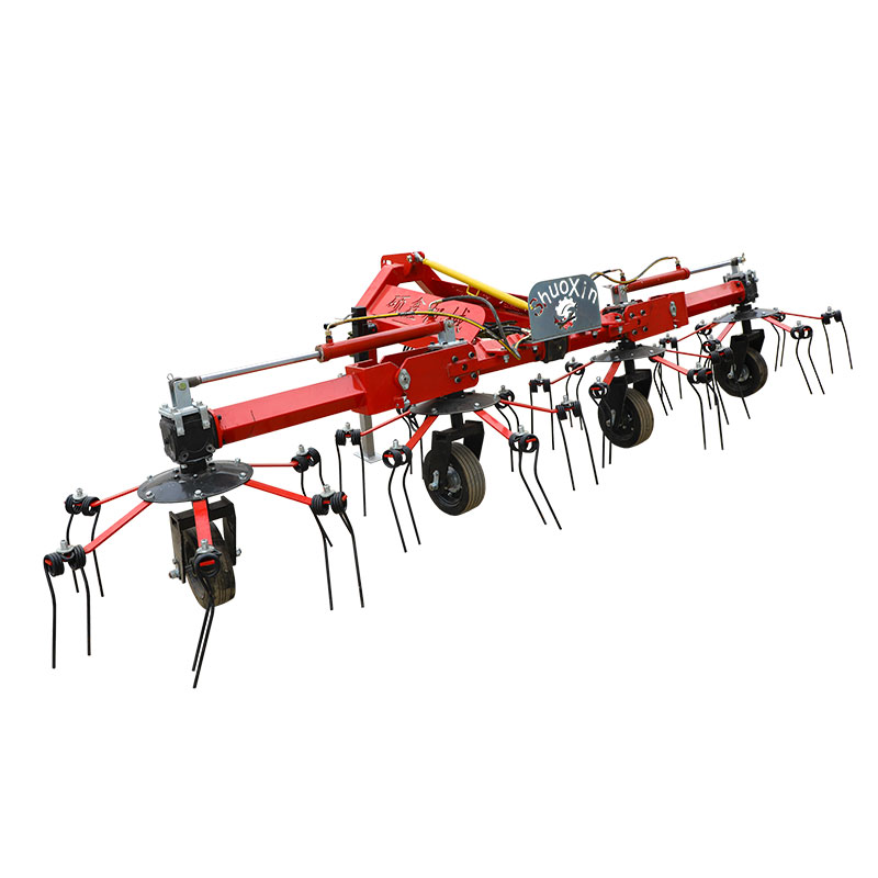 Distribue 6 bras de râteau le long de la circonférence. Les dents de râteau sont fixées sur le disque rotatif. L'extrémité de chaque bras dentaire Râteau fixe une paire de dents de râteau à ressort. Lorsque le râteau est en service, la puissance du bras dentaire de râteau est fournie par la platine et le bras dentaire de râteau est tourné par le disque de rotation, réalisant ainsi le fonctionnement du râteau.