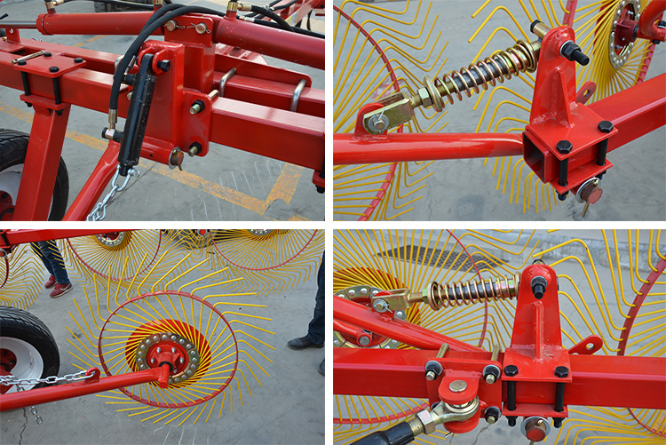 Les râteaux de foin de roues sont équipés d'une conception de dents larges pour couvrir une zone de travail plus large en même temps, augmentant considérablement l'efficacité de ratissage. Dans le même temps, les dents de râteau sont faites de matériaux résistants à l'usure pour s'assurer qu'ils peuvent rester tranchants pendant longtemps, ce qui réduit efficacement la résistance pendant le processus de ratissage, ce qui rend le fonctionnement plus lisse.